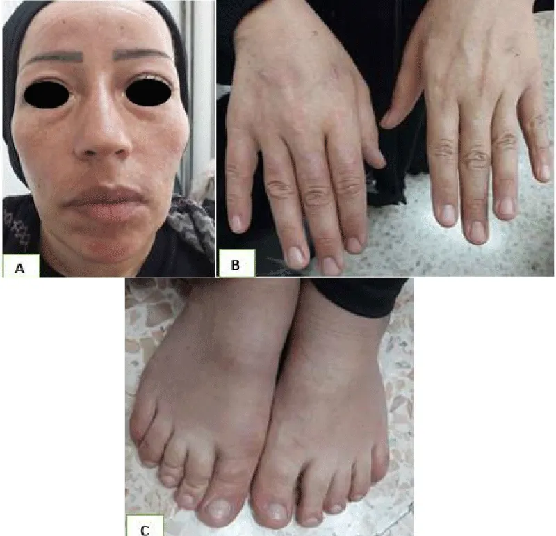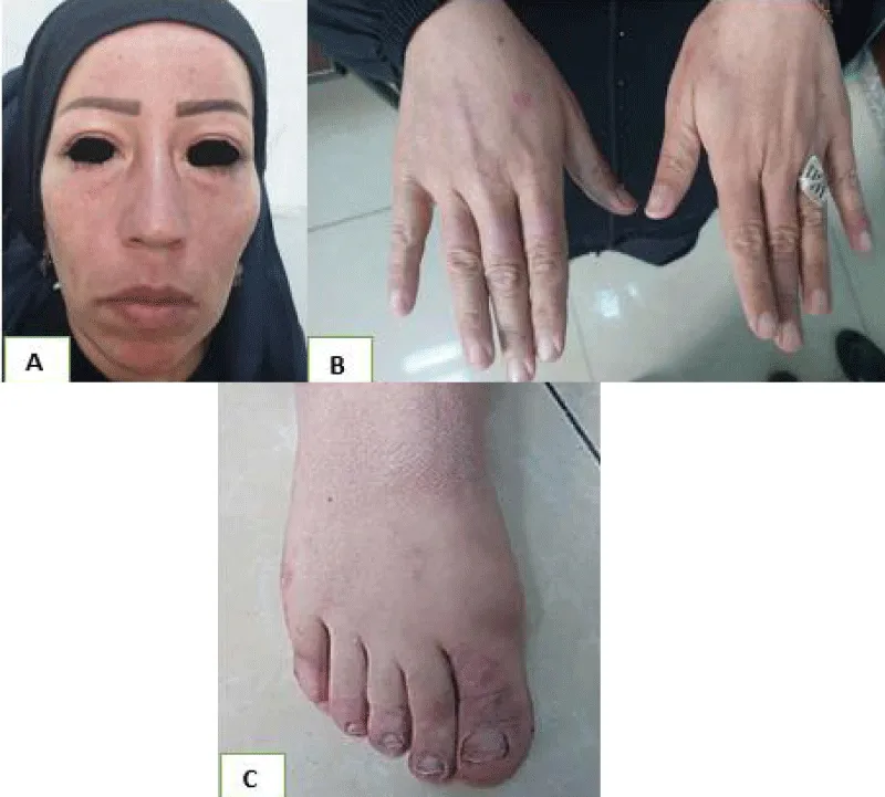 Figure 1: A- Malar rash on the face. B- Multiple popular lesions on the hands. C- chilblain-like lesions on the feet.