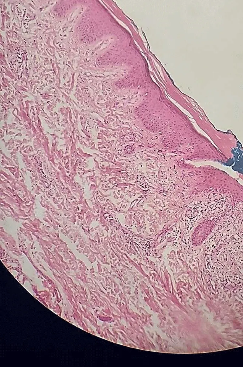 Figure 2: A-histological finding of CHLE: hyperkeratosis, degeneration of the basal area, fibrin deposition on the basement membrane, and a superficial and deep lymphocytic vascular reaction.